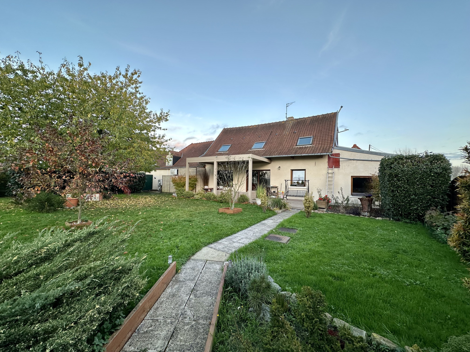 Côté extérieur arrière, vous profiterez d'une grande terrasse avec pergola bioclimatique équipée d'éclairage et de détecteur de pluie, d'un abris de jardin et d'un bel espace gazon joliment arboré. Côté extérieur avant, vous pourrez stationner plusieurs véhicules dans la cour macadamisée, sécurisée par un portail motorisé.